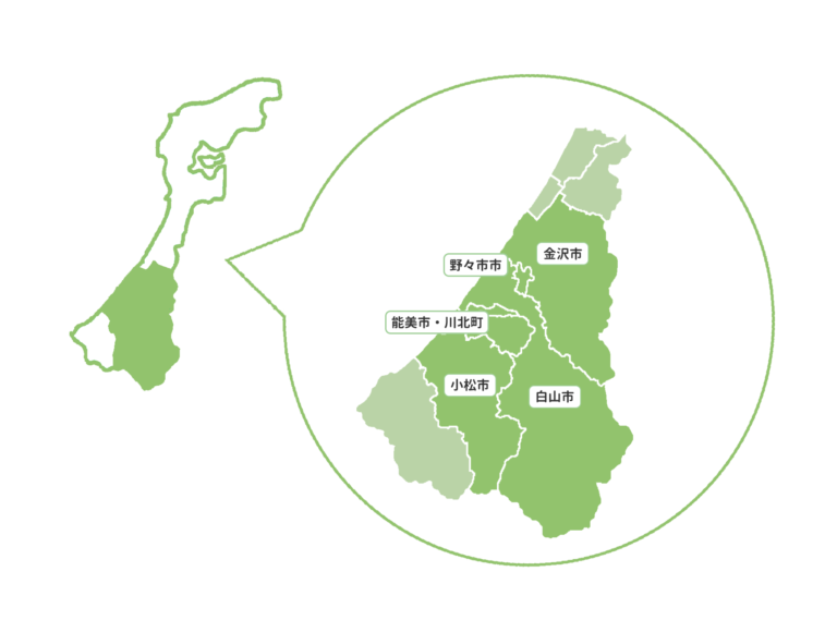 金沢市、野々市市、白山市、小松市、能美市・川北町の地域を対象に出張相談に対応しております。