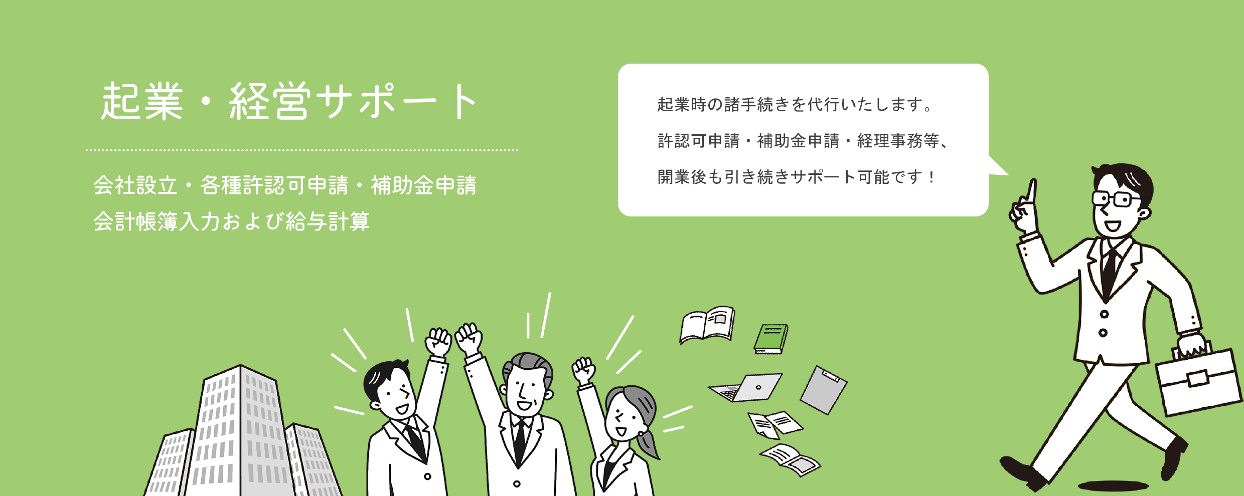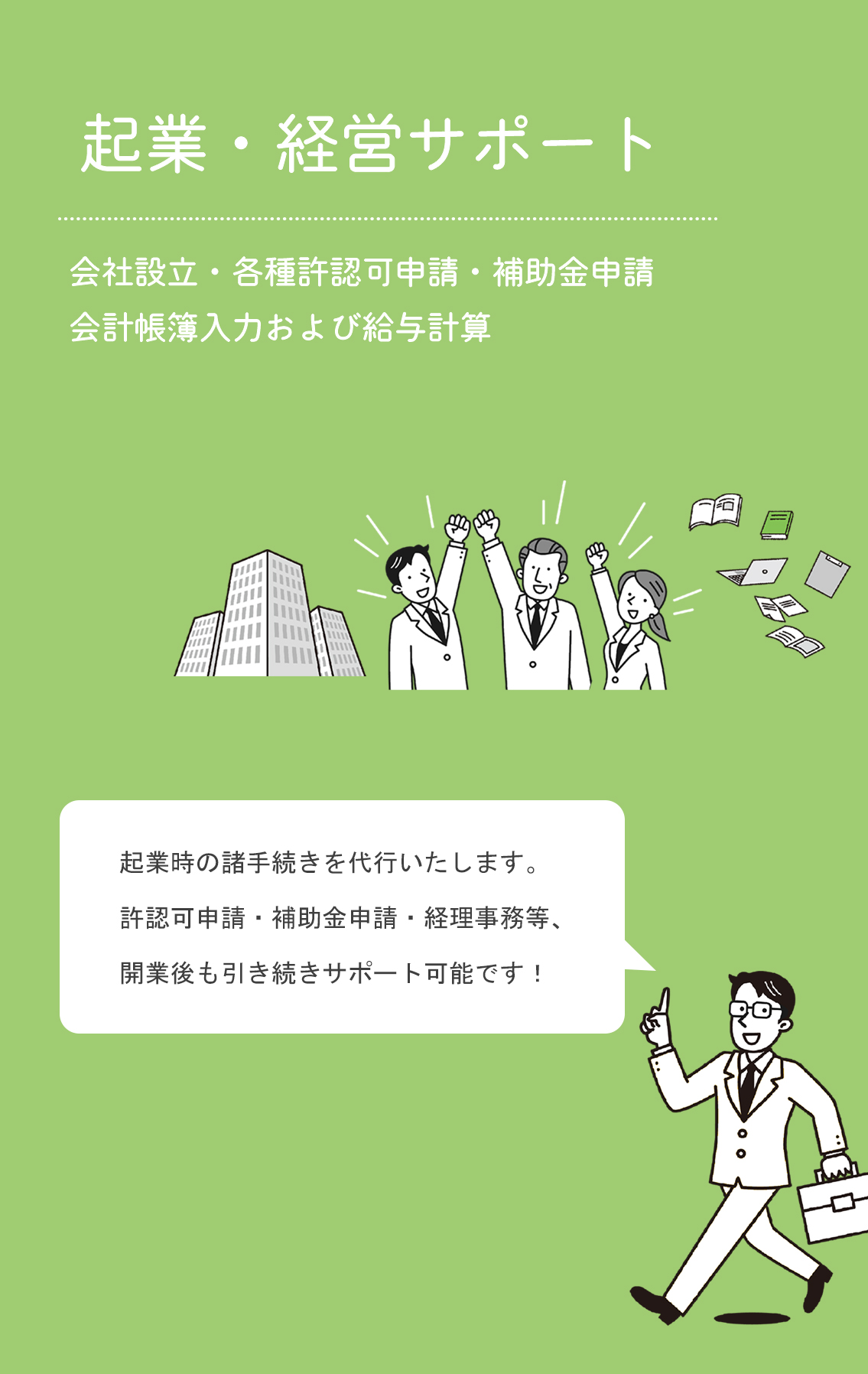補助金および助成金(雇用関係のものを除く)の申請を代行いたします。まずは利用条件を満たしているか確認しますのでお気軽にご相談ください。【対象補助金/R4年2月時点】事業復活支援金